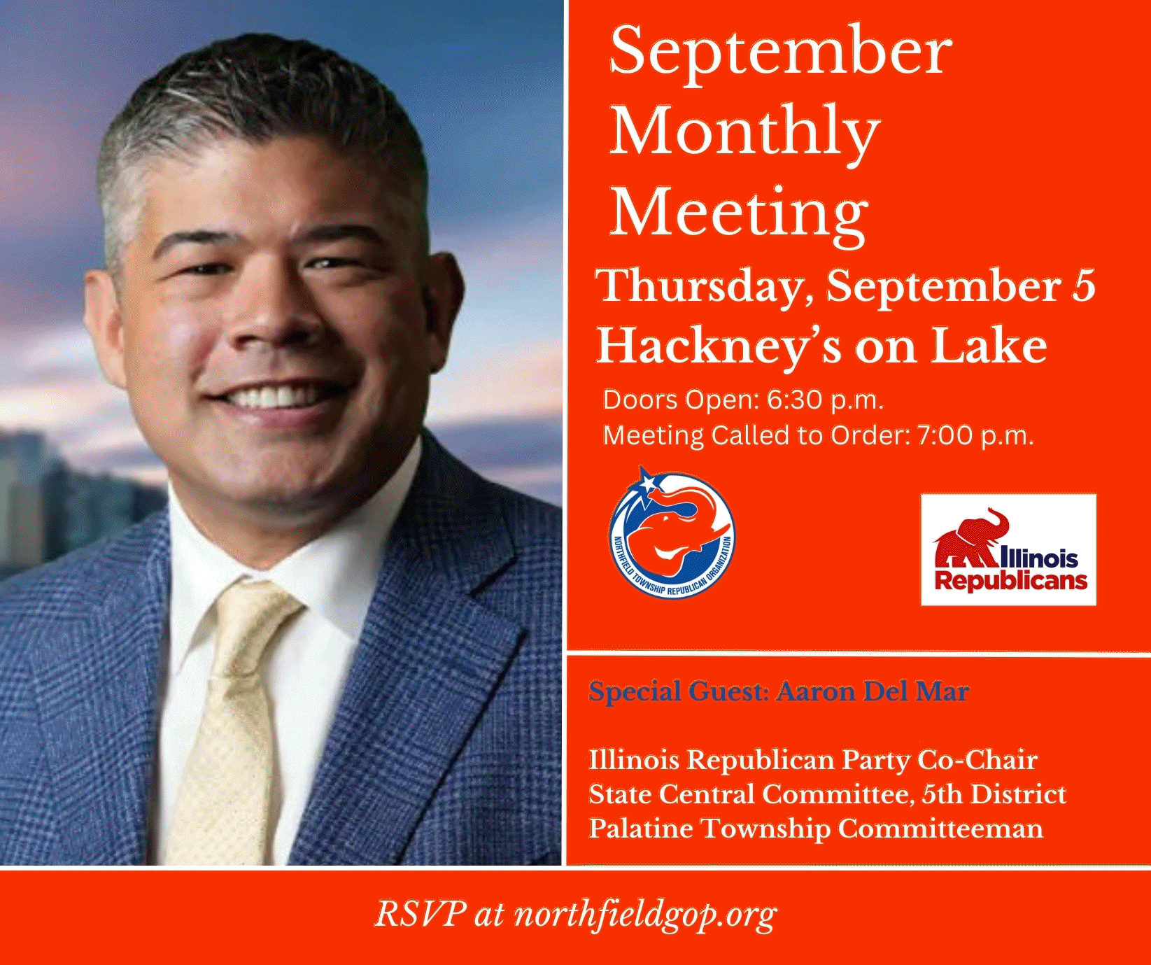 Come out to NTGOP's September monthly meeting and hear from newly appointed Illinois Republican Party Co-Chair Aaron Del Mar on the changes in the Illinois Republican Party and the road ahead of us as we rebuild our party and reclaim our state.